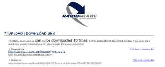 RapidShare è tra i più noti servizi di file hosting. Permette di caricare archivi e condividerli con chi vuoi tu e dove vuoi tu (e-mail, social network, forum, blog e così via). La fase di upload è molto semplice: dalla home dovrai solo scegliere il file, fino a un massimo di 500 MB, e avviare l'operazione. Al termine RapidShare ti mostrerà il link di download da condividere con i tuoi amici, un secondo link per consentirti la rimozione veloce dell'archivio dai server di RapidShare ed infine il valore MD5 del file.